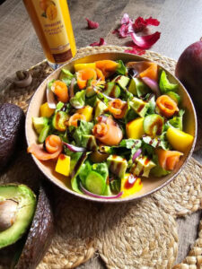 Préparez la sauce en mélangeant le vinaigre de mangue, le vinaigre balsamique et le jus de citron vert. Disposez dans une assiette la sucrine coupée, les cubes de mangue, l’avocat, la truite fumée et l’oignon rouge. Ajoutez la sauce, puis servez immédiatement.